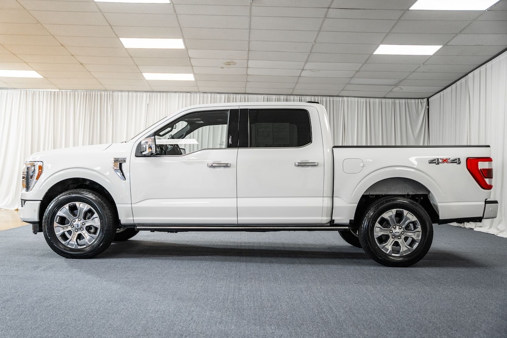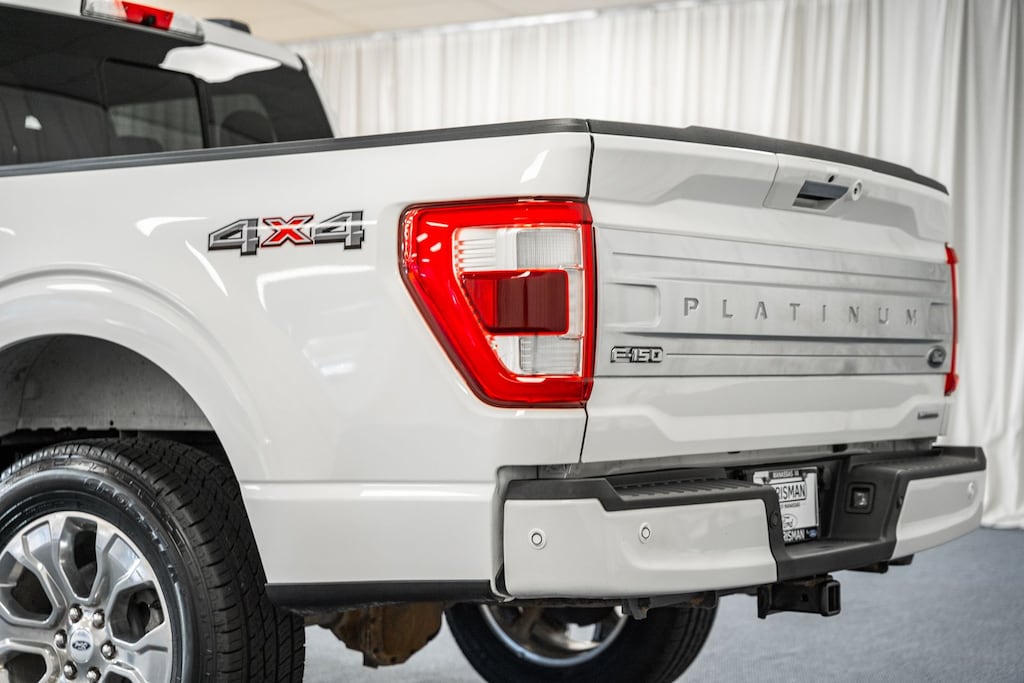 PANORAMIC ROOF / DUAL SUNROOFS / TWIN PANEL MOONROOF, POWER MOONROOF / SUNROOF / POWER TILT SLIDING ROOF, BLIS / BLIND SPOT MONITORING / BLIND SIDE ALERT, DYNAMIC RADAR CRUISE CONTROL / ADAPTIVE CRUISE CONTROL / SMART CRUISE CONTROL, LANE DEPARTURE WARNING, LANE DEPARTURE ALERT / LANE KEEPING ALERT, REARVIEW CAMERA / BACK UP CAMERA / REVERSE CAMERA, REAR VIEW CAMERA WDYNAMIC GUIDELINES, ANDROID AUTO & APPLE CARPLAY, HEATED & COOLED FRONT ROW SEATS, HEATED FRONT ROW SEATS, HEATED SECOND ROW SEATS, POWER WINDOWS & LOCKS, FOUR WHEEL DRIVE / 4WD / 4X4, STEERING WHEEL AUDIO CONTROLS, CRUISE CONTROL, SYNC 4, WIRELESS CHARGING, REMOTE START, PUSH-BUTTON START, POWER TAILGATE LOCK, POWER SLIDING REAR WINDOW, BLUETOOTH & BLUETOOTH STREAMING, HEATED STEERING WHEEL, DUAL ZONE A/C CONTROLS, BACK UP SENSORS, B&O SOUND SYSTEM, AUTO HIGH BEAMS, 360- DEGREE CAMERA, 36 GALLON TANK / 36 GAL TANK, 145" WHEELBASE, 3.31 Axle Ratio, 360 Degree Camera, ABS brakes, Active Park Assist 2.0, Adjustable pedals, Air Conditioning, Alloy wheels, AM/FM radio: SiriusXM with 360L, Auto High-beam Headlights, Automatic temperature control, BlueCruise Hands-Free Driving, Compass, Electronic Stability Control, Equipment Group 701A High, Ford Co-Pilot360 Active 2.0 Package, Front Bucket Seats, Front Center Armrest, Front dual zone A/C, Fully automatic headlights, GVWR: 7,050 lbs Payload Package, Heated door mirrors, Heated front seats, Heated rear seats, Illuminated entry, Integrated Trailer Brake Controller, Low tire pressure warning, Navigation system: Connected Navigation (90-Day Trial), Panic alarm, Passenger door bin, Power driver seat, Power steering, Power Tailgate, Power windows, Pro Trailer Backup Assist, Radio: B&O Sound System by Bang & Olufsen, Radio: B&O Unleashed Sound System by Bang & Olufsen, Remote keyless entry, Speed control, Speed-sensing steering, Steering wheel memory, SYNC 4 w/Enhanced Voice Recognition, Tow Technology Package, Traction control. 2021 Ford F-150 Platinum 4WD Star White Metallic Tri-Coat 3.5L V6 EcoBoost