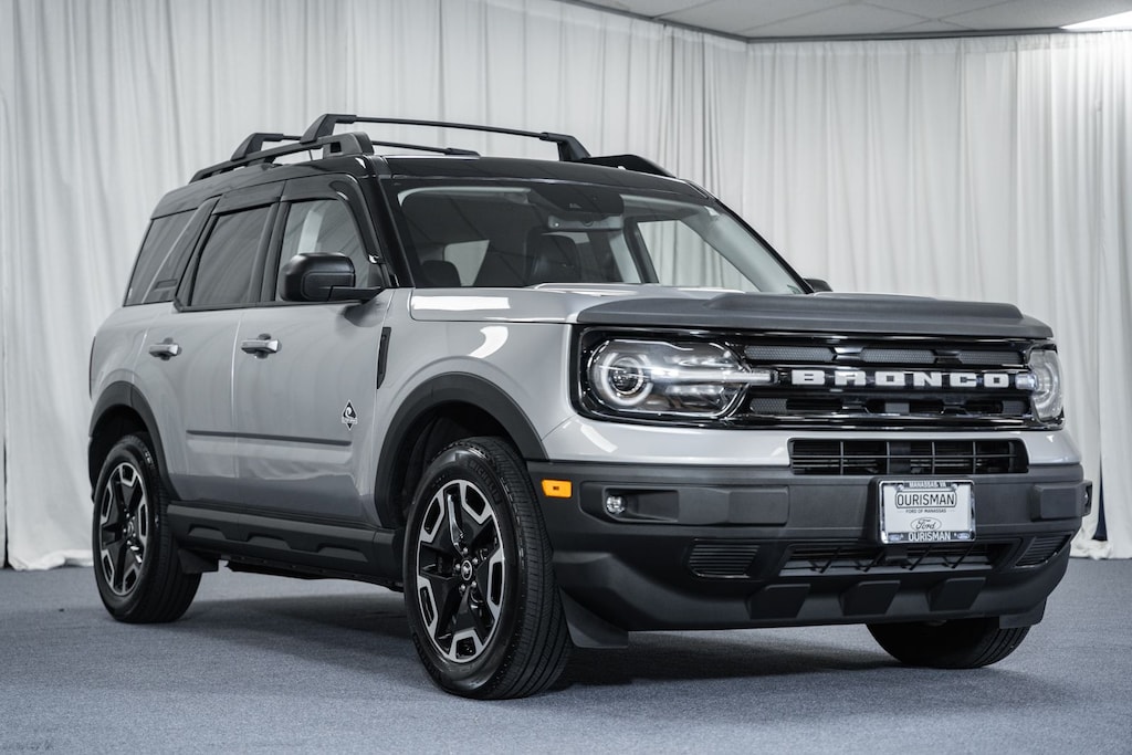 POWER MOONROOF / SUNROOF / POWER TILT SLIDING ROOF, REARVIEW CAMERA / BACK UP CAMERA / REVERSE CAMERA, REAR VIEW CAMERA WDYNAMIC GUIDELINES, ANDROID AUTO & APPLE CARPLAY, POWER WINDOWS & LOCKS, FOUR WHEEL DRIVE / 4WD / 4X4, STEERING WHEEL AUDIO CONTROLS, CRUISE CONTROL, SYNC 3, SYNC, WIRELESS CHARGING, REMOTE START, PUSH-BUTTON START, PREMIUM AUDIO SOUND SYSTEM, BLUETOOTH AUDIO STREAMING, BLUETOOTH & BLUETOOTH STREAMING, BLUETOOTH HANDS-FREE PHONE SYSTEM, ONE OWNER, HEATED STEERING WHEEL, ECO BOOST ENGINE, DUAL ZONE A/C CONTROLS, BLUETOOTH, BACK UP SENSORS, B&O SOUND SYSTEM, AUTO HIGH BEAMS, 3.80 Axle Ratio, 4-Wheel Disc Brakes, Air Conditioning, Cargo Management System, Delay-off headlights, Dual front impact airbags, Electronic Stability Control, Emergency communication system: SYNC 3 911 Assist, Equipment Group 300A, Four wheel independent suspension, Front Bucket Seats, Front dual zone A/C, Fully automatic headlights, HD Radio, Knee airbag, Occupant sensing airbag, Power Moonroof, Rear anti-roll bar, Rear Parking Sensors, Rear window wiper, Remote keyless entry, Security system, Speed control, Tech Package, Traction control, Universal Garage Door Opener (UGDO), Variably intermittent wipers, Wheels: 18" Ebony Black-Painted Aluminum, Wireless Charging Pad. 2022 Ford Bronco Sport Outer Banks 4WD Iconic Silver Metallic 1.5L EcoBoost