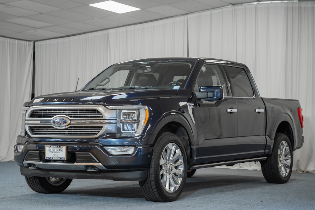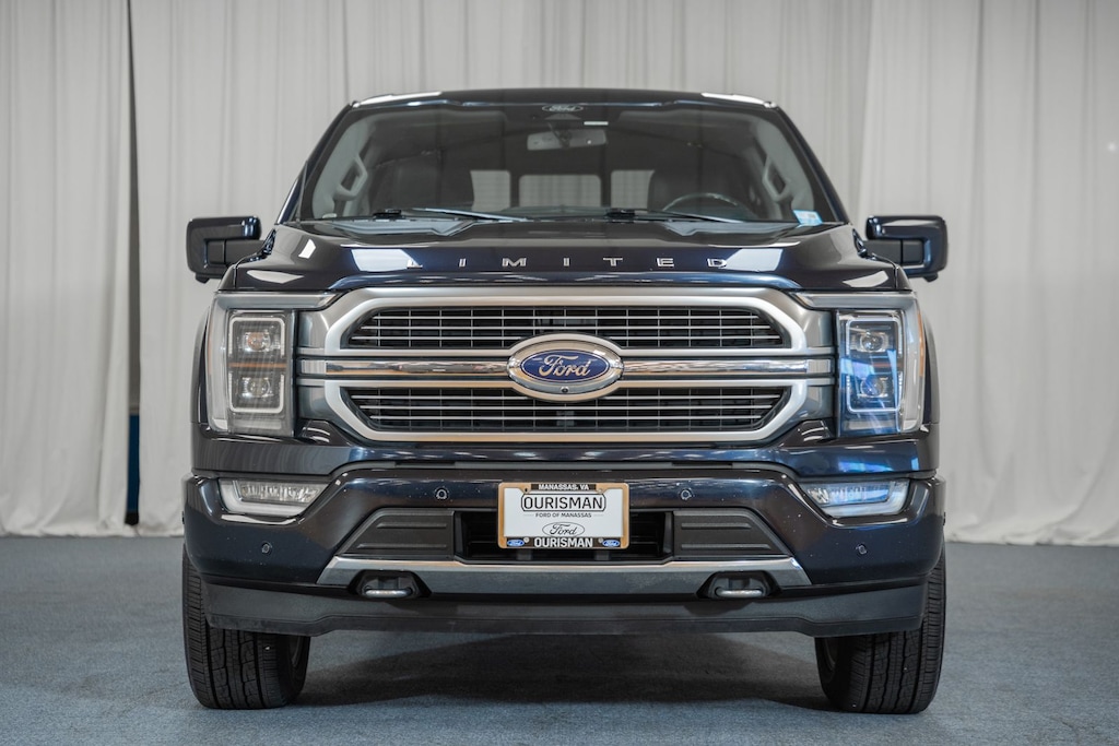 PANORAMIC ROOF / DUAL SUNROOFS / TWIN PANEL MOONROOF, POWER MOONROOF / SUNROOF / POWER TILT SLIDING ROOF, VOICE ACTIVATED NAVIGATION, NAVIGATION / GPS / NAV, FORD CO-PILOT360, BLIS / BLIND SPOT MONITORING / BLIND SIDE ALERT, DYNAMIC RADAR CRUISE CONTROL / ADAPTIVE CRUISE CONTROL / SMART CRUISE CONTROL, LANE DEPARTURE WARNING, LANE DEPARTURE ALERT / LANE KEEPING ALERT, REARVIEW CAMERA / BACK UP CAMERA / REVERSE CAMERA, REAR VIEW CAMERA WDYNAMIC GUIDELINES, ANDROID AUTO & APPLE CARPLAY, LEATHER SEATS, HEATED & COOLED FRONT ROW SEATS, HEATED FRONT ROW SEATS, POWER WINDOWS & LOCKS, FOUR WHEEL DRIVE / 4WD / 4X4, STEERING WHEEL AUDIO CONTROLS, CRUISE CONTROL, SYNC 4, WIRELESS CHARGING, REMOTE START, REAR CROSS TRAFFIC ALERT, PUSH-BUTTON START, PREMIUM AUDIO W/INTEGRATED NAV & APP STE, POWER TAILGATE LOCK, POWER SLIDING REAR WINDOW, BLUETOOTH AUDIO STREAMING, HEATED STEERING WHEEL, DUAL ZONE A/C CONTROLS, BLUETOOTH, BACK UP SENSORS, B&O SOUND SYSTEM, AUTO HIGH BEAMS, 360- DEGREE CAMERA, 145" WHEELBASE, 3.5L PowerBoost Full-Hybrid V6, 4WD, 22" Polished Aluminum Wheels, 4-Wheel Disc Brakes, ABS brakes, Air Conditioning, Alloy wheels, Automatic temperature control, Brake assist, Compass, Electronic Locking w/3.73 Axle Ratio, Electronic Stability Control, Equipment Group 900A Standard, Exterior Parking Camera Rear, Front Bucket Seats, Front Center Armrest, Front dual zone A/C, Front fog lights, Front reading lights, Fully automatic headlights, Heated door mirrors, Heated front seats, Low tire pressure warning, Max Recline Driver & Passenger Seat, Navigation System, Navigation system: Connected Navigation, Panic alarm, Passenger door bin, Power door mirrors, Power steering, Power windows, Radio data system, Rear reading lights, Rear step bumper, Rear window defroster, Remote keyless entry, Security system, Speed control, Speed-sensing steering, Split folding rear seat, Steering wheel mounted audio controls, Traction control, Variably intermittent wipers, Ventilated front seats. 2022 Ford F-150 Limited 4WD Antimatter Blue Metallic 3.5L PowerBoost Full-Hybrid V6