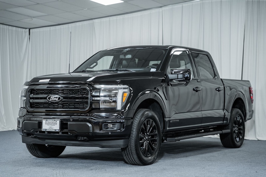 PANORAMIC ROOF / DUAL SUNROOFS / TWIN PANEL MOONROOF, POWER MOONROOF / SUNROOF / POWER TILT SLIDING ROOF, VOICE ACTIVATED NAVIGATION, NAVIGATION / GPS / NAV, BLIS / BLIND SPOT MONITORING / BLIND SIDE ALERT, DYNAMIC RADAR CRUISE CONTROL / ADAPTIVE CRUISE CONTROL / SMART CRUISE CONTROL, LANE DEPARTURE WARNING, LANE DEPARTURE ALERT / LANE KEEPING ALERT, REARVIEW CAMERA / BACK UP CAMERA / REVERSE CAMERA, REAR VIEW CAMERA WDYNAMIC GUIDELINES, ANDROID AUTO & APPLE CARPLAY, HEATED & COOLED FRONT ROW SEATS, HEATED FRONT ROW SEATS, HEATED SECOND ROW SEATS, POWER WINDOWS & LOCKS, FOUR WHEEL DRIVE / 4WD / 4X4, STEERING WHEEL AUDIO CONTROLS, CRUISE CONTROL, SYNC 4, WIRELESS CHARGING, REMOTE START, REAR CROSS TRAFFIC ALERT, PUSH-BUTTON START, POWER SLIDING REAR WINDOW, BLUETOOTH AUDIO STREAMING, HEATED STEERING WHEEL, DUAL ZONE A/C CONTROLS, BLUETOOTH, BACK UP SENSORS, BLUECRUISE, B&O SOUND SYSTEM, AUTO HIGH BEAMS, 360- DEGREE CAMERA, 145" WHEELBASE, 2nd Row Heated Seats, 4 Pickup Box Tie-Down Plates, 4-Wheel Disc Brakes, 4x4 FX4 Off-Road Bodyside Decal, 8 Speakers, ABS brakes, ActiveX Trimmed Bucket Seats (B), Air Conditioning, Ambient Lighting - Ice Blue Color Only, Auto High-beam Headlights, Automatic temperature control, Bed Utility Package, Black Exterior Badging, Black Grille, Black Taillamp Bezels, Body-Color Front & Rear Bumpers, Body-Color Skull Caps & Door Handles, Brake assist, Compass, Console Worksurface, Dark Interior Appliques, Delay-off headlights, Electronic Locking w/3.31 Axle Ratio, Equipment Group 502A High, Front Bucket Seats, Front Center Armrest, Front dual zone A/C, Front fog lights, Front reading lights, Fully automatic headlights, FX4 Off-Road Package, Gray Box Side Decal, Heads-Up Display, Heated front seats, Heated steering wheel, Hill Descent Control, Illuminated Driver & Passenger Visors, Lariat Black Appearance Package, LED Box Lighting, Low tire pressure warning, Matte Black Tailgate F-150 Decal, Mobile Office Package, Monotube Rear Shocks, Navigation System, Navigation system: Connected Navigation, Off-Road Tuned Front Shock Absorbers, Panic alarm, Partitioned Lockable Rear Storage, Power driver seat, Power passenger seat, Power steering, Power Tailgate, Power windows, Power-Sliding Rear Window, Pro Access Tailgate, Pro Power Onboard - 7.2KW, Radio: B&O Sound System by Bang & Olufsen, Radio: B&O Unleashed Sound System by Bang & Olufsen, Rain sensing wipers, Rear window defroster, Remote keyless entry, Rock Crawl Mode, Speed control, Split folding rear seat, Steering wheel mounted audio controls, SYNC 4 w/Enhanced Voice Recognition, Tray Style Floor Liner w/o Carpet Mats, Twin Panel Moonroof, Variably intermittent wipers, Ventilated front seats, Wheels: 20" Chrome-Like PVD, Wireless Charging. 2025 Ford F-150 Lariat Hybrid Black Pkg Pro Power Bluecruise 4WD Agate Black Metallic 3.5L PowerBoost Full-Hybrid V6