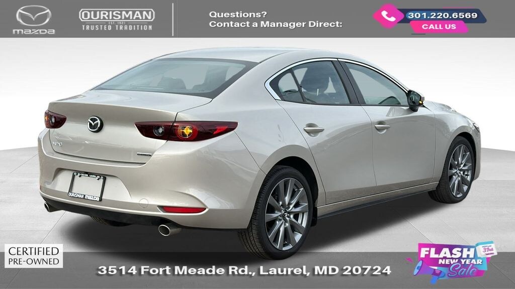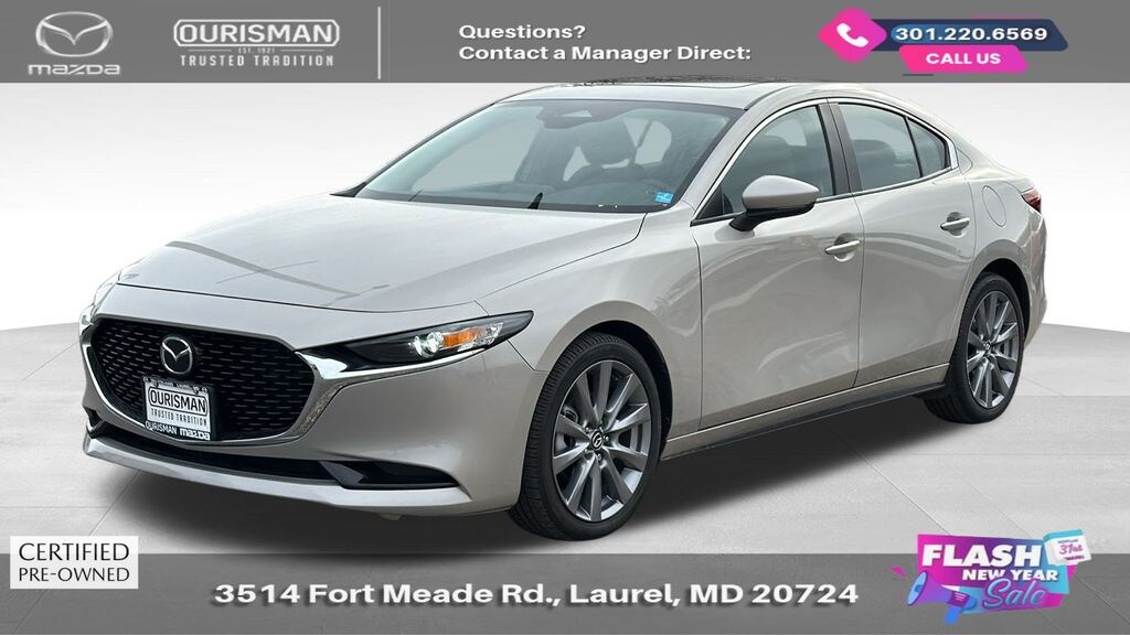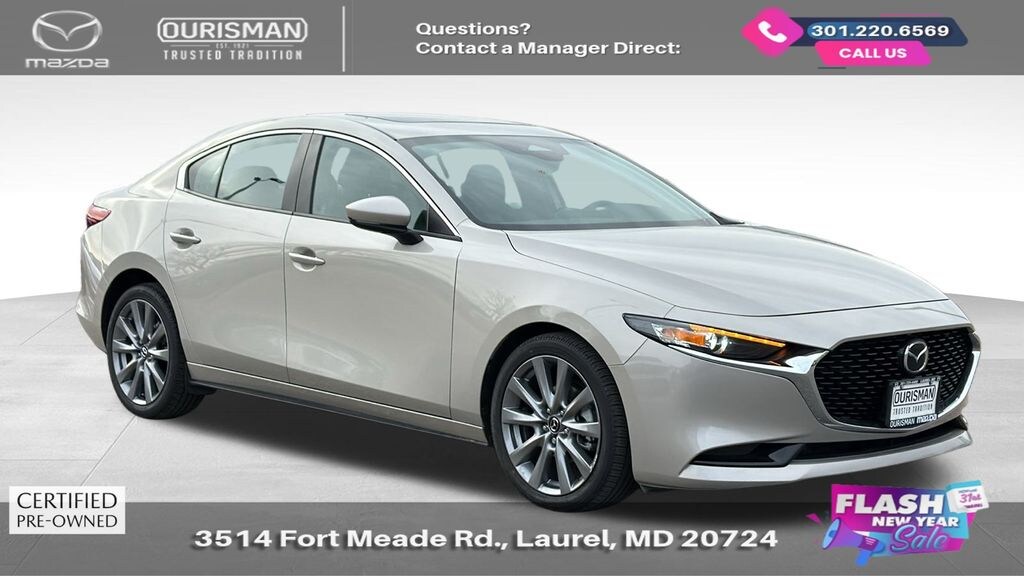 2025 Mazda Mazda3 2.5 S Preferred Package Platinum Quartz Metallic FWD Certified. MAZDA CERTIFIED, SUNROOF/MOONROOF, BLUETOOTH/HANDS FREE, REAR VIEW CAMERA/BACKUP CAMERA, BLIND SPOT MONITORING SYSTEM, LANE KEEP ASSIST/LANE MITIGATION/ACTIVE LANE ASSIST, HEATED SEATS, APPLE CARPLAY/ANDROID AUTO, PRE-COLLISION SYSTEM/BRAKE SYSTEM, LEATHER INTERIOR, ACTIVE CRUISE CONTROL/ADAPTIVE CRUISE CONTROL, 1 OWNER CARFAX, POWER ADJUSTABLE SEATS, ADVANCED KEYLESS ENTRY, REAR CROSS TRAFFIC ALERT. Buyers should take pride in knowing that Maryland has one of the most comprehensive state inspections in the country. Awards: * ALG Residual Value Awards, Residual Value Awards We know you have done a great deal of research, and you don't have time for hours of back-and-forth negotiations. At Ourisman Laurel Campus, your hassle-free purchase is backed by our extensive Market Research. Our No-Haggle pricing ensures you the best value on your vehicle-no games, no gimmicks. Unlike our competitors, we don't add any additional fees to the posted price or certification. You pay only the posted price of the vehicle plus Sales tax, your registration and a MD processing charge of $800Not required by law. Come see why Ourisman Mazda, Mitsubishi, Hyundai, Nissan in Laurel (Ourisman Laurel Campus) offers you the best value for your money! Serving Frederick, Rockville, Hagerstown, Potomac, Baltimore, Silver Spring, DC, Howard County, Washington County, Montgomery County, Anne Arundel. Maryland State Inspected with over 120 point inspection performed by a trained technician. Buyers should take pride in knowing that Maryland has one of the most comprehensive state inspections in the country.