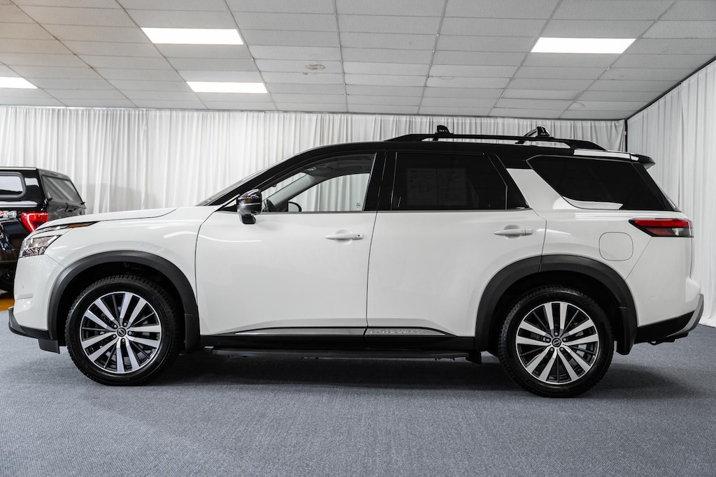 NAVIGATION / GPS / NAV, BLIS / BLIND SPOT MONITORING / BLIND SIDE ALERT, DYNAMIC RADAR CRUISE CONTROL / ADAPTIVE CRUISE CONTROL / SMART CRUISE CONTROL, LANE DEPARTURE WARNING, LANE DEPARTURE ALERT / LANE KEEPING ALERT, REARVIEW CAMERA / BACK UP CAMERA / REVERSE CAMERA, REAR VIEW CAMERA WDYNAMIC GUIDELINES, ANDROID AUTO & APPLE CARPLAY, HANDS FREE LIFTGATE / POWER LIFT GATE / AUTOMATIC LIFT GATE, HEATED FRONT ROW SEATS, HEATED SECOND ROW SEATS, POWER WINDOWS & LOCKS, FOUR WHEEL DRIVE / 4WD / 4X4, STEERING WHEEL AUDIO CONTROLS, CRUISE CONTROL, PUSH-BUTTON START, BLUETOOTH AUDIO STREAMING, HEATED STEERING WHEEL, DUAL ZONE A/C CONTROLS, BACK UP SENSORS, AUTO HIGH BEAMS, 13 Speakers, 4-Wheel Disc Brakes, Air Conditioning, Automatic temperature control, Cargo Area Protector, Cargo Net, Cargo Package, Exterior Parking Camera Rear, First Aid Kit, Front Bucket Seats, Front Center Armrest, Front dual zone A/C, Fully automatic headlights, Heated front seats, Heated rear seats, Heated steering wheel, Illuminated Kick Plate, Lighting Package (N93), Low tire pressure warning, Navigation system: NissanConnect Navigation, Power driver seat, Power Liftgate, Power passenger seat, Power steering, Power windows, Rear air conditioning, Rear window defroster, Remote keyless entry, Speed control, Spoiler, Traction control, Welcome Lighting. 2022 Nissan Pathfinder Platinum 4WD Pearl White Tricoat/Super Black V6