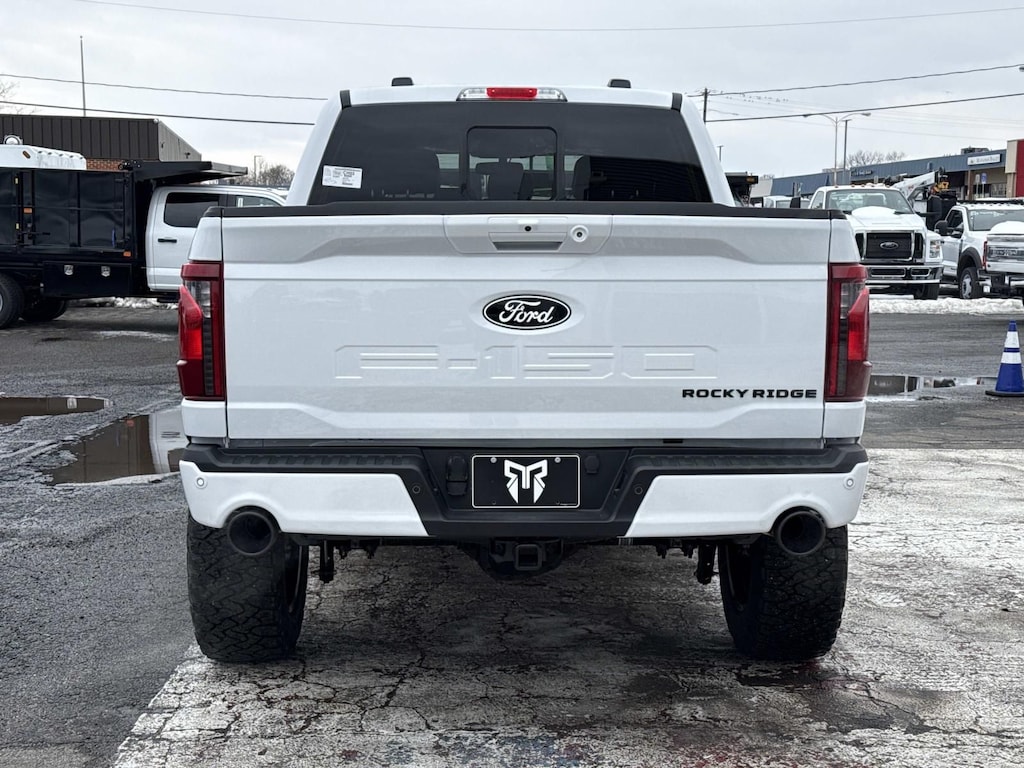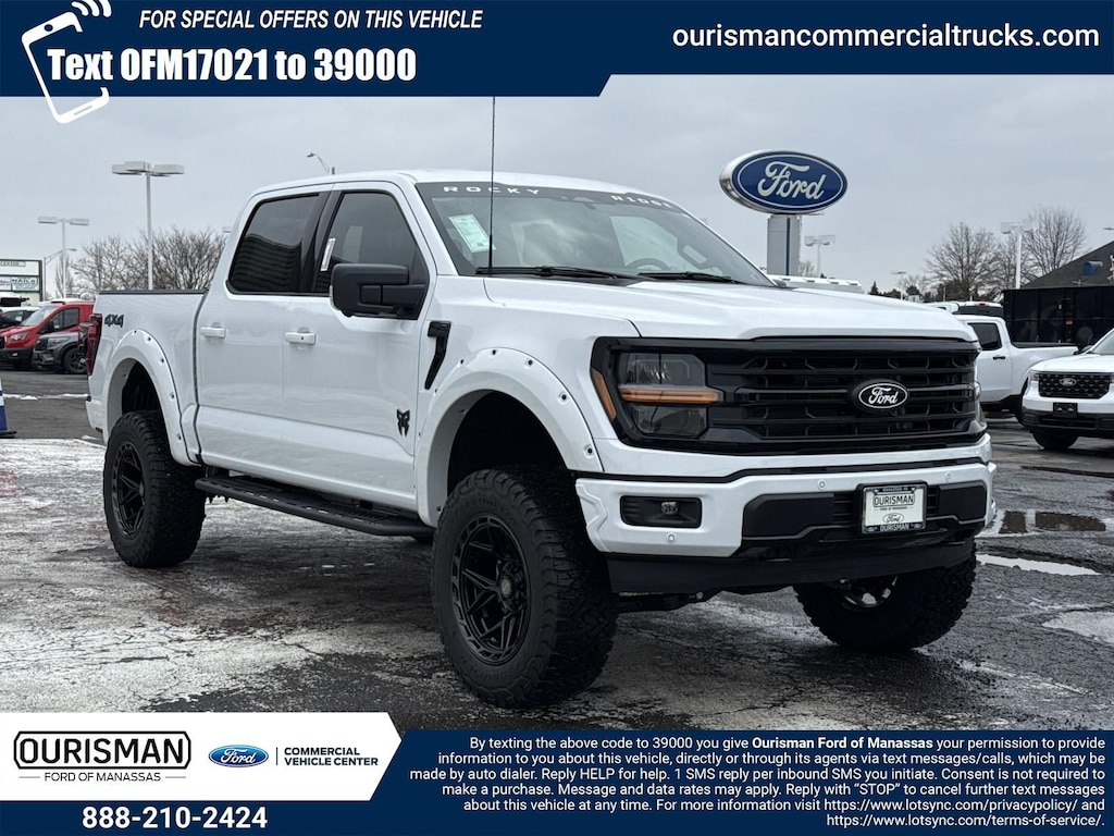 2025 Ford F-150 XLT Rocky Ridge 4x4 Crew Cab Oxford White 4WD 5.0L V8 BLIS / BLIND SPOT MONITORING / BLIND SIDE ALERT, DYNAMIC RADAR CRUISE CONTROL / ADAPTIVE CRUISE CONTROL / SMART CRUISE CONTROL, LANE DEPARTURE WARNING, LANE DEPARTURE ALERT / LANE KEEPING ALERT, REARVIEW CAMERA / BACK UP CAMERA / REVERSE CAMERA, REAR VIEW CAMERA WDYNAMIC GUIDELINES, ANDROID AUTO & APPLE CARPLAY, HEATED FRONT ROW SEATS, POWER WINDOWS & LOCKS, FOUR WHEEL DRIVE / 4WD / 4X4, STEERING WHEEL AUDIO CONTROLS, CRUISE CONTROL, SYNC 4, WIRELESS CHARGING, REMOTE START, REAR CROSS TRAFFIC ALERT, PUSH-BUTTON START, POWER SLIDING REAR WINDOW, BLUETOOTH AUDIO STREAMING, BLUETOOTH & BLUETOOTH STREAMING, BLUETOOTH HANDS-FREE PHONE SYSTEM, LEATHERETTE SEATS, HEATED STEERING WHEEL, DUAL ZONE A/C CONTROLS, BLUETOOTH, BACK UP SENSORS, B&O SOUND SYSTEM, AUTO HIGH BEAMS, 360- DEGREE CAMERA, 145" WHEELBASE, ROCKY RIDGE PACKAGE, 6 inch suspension lift system, Fox 2.0 rear shocks, 20 inch rocky ridge wheels, 35 inch premium all terrain tires, Body color pocket fender flares, Black cab length side steps, Performance exhaust, Rocky ridge custom stitch headrests, All-weather floor mats, Tinted front windows, Rocky ridge exterior badging, rocky ridge serialization badge, Rocky ridge windshield banner, Fmvss compliant, 3 year / 36k mile warranty, 360 Degree Camera, 4 Pickup Box Tie-Down Plates, 4-Wheel Disc Brakes, 400W Cab & Bed Outlets, 6 Speakers, 6" Angular Bright Anodized Step Bar, 6" Black Running Boards, ABS brakes, Adaptive Cruise Control w/Stop & Go, Air Conditioning, Auto High-beam Headlights, Auto-Dimming Rear-View Mirror, Bed Utility Package, Black Exterior Badging, Black Grille, Black Painted Grille w/Chrome Center Bar, Body-Color Front & Rear Bumpers, Brake assist, Chrome Door & Tailgate Handles, Chrome Single-Tip Exhaust, Cloth 40/20/40 Front Seat, Compass, Connected Navigation, Console Worksurface, Dark Interior Appliques, Delay-off headlights, Driver door bin, Driver State Detection, Driver vanity mirror, Dual Exhaust w/Black Tips, Dual-Zone Electronic Automatic Temperature Control, Electronic Stability Control, Equipment Group 303A High, Evasive Steering Assist, Floor Shifter, Ford Co-Pilot360 Assist 2.0, Front Center Armrest, Front fog lights, Front Parking Sensors, Front reading lights, Fully automatic headlights, Gray Box Side Decal, Heated door mirrors, Heated Front Seats, Illuminated entry, Intelligent Access w/Push Button Start, Internet access capable: FordPass Connect 5G, LED Box Lighting, Low tire pressure warning, Mobile Office Package, Panic alarm, Partitioned Lockable Rear Storage, Passenger door bin, Passenger vanity mirror, Power door mirrors, Power Glass Heated Sideview Mirrors, Power steering, Power windows, Power-Adjustable Pedals, Power-Sliding Rear Window, Radio data system, Radio: AM/FM Stereo w/SiriusXM 360L, Radio: B&O Sound System by Bang & Olufsen, Rear Parking Sensors, Rear reading lights, Rear step bumper, Rear window defroster, Remote keyless entry, Remote Start System w/Remote Tailgate Release, Security system, Speed control, Split folding rear seat, Steering wheel mounted audio controls, SYNC 4 w/Enhanced Voice Recognition, Tailgate Step w/Tailgate Work Surface, Tilt steering wheel, Towing Technology, Traction control, Trip computer, Variably intermittent wipers, Voltmeter, Wheel Well Liner, Wireless Charging, Wrapped Steering Wheel, XLT Black Appearance Package Plus.