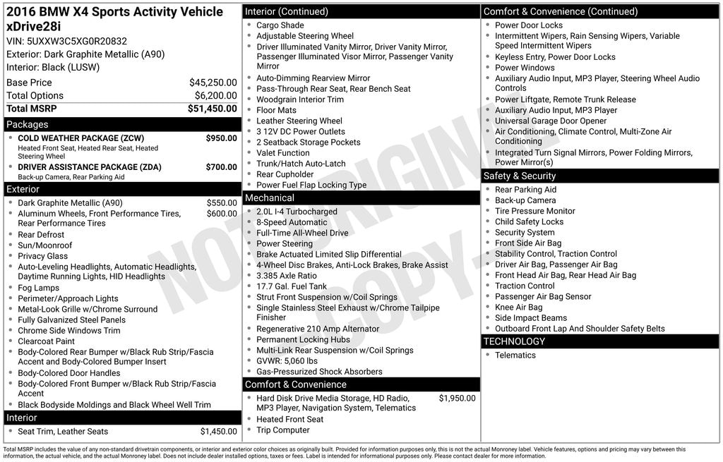 2016 BMW X4 xDrive28i Dark Graphite AWD NAVIGATION/NAVI/NAV SYSTEM/GPS, SUNROOF/MOONROOF, BLUETOOTH/HANDS FREE, REAR VIEW CAMERA/BACKUP CAMERA, BLIND SPOT MONITORING SYSTEM, HEATED SEATS, Cold Weather Package, Driver Assistance Package, Heated Front Seats, Heated Rear Seats, Heated Steering Wheel, Park Distance Control, Rear-View Camera, Retractable Headlight Washers. Buyers should take pride in knowing that Maryland has one of the most comprehensive state inspections in the country. Awards: * ALG Residual Value Awards, Residual Value Awards We know you have done a great deal of research, and you don't have time for hours of back-and-forth negotiations. At Ourisman Laurel Campus, your hassle-free purchase is backed by our extensive Market Research. Our No-Haggle pricing ensures you the best value on your vehicle-no games, no gimmicks. Unlike our competitors, we don't add any additional fees to the posted price or certification. You pay only the posted price of the vehicle plus Sales tax, your registration and a MD processing charge of $800Not required by law. Come see why Ourisman Mazda, Mitsubishi, Hyundai, Nissan in Laurel (Ourisman Laurel Campus) offers you the best value for your money! Serving Frederick, Rockville, Hagerstown, Potomac, Baltimore, Silver Spring, DC, Howard County, Washington County, Montgomery County, Anne Arundel. Maryland State Inspected with over 120 point inspection performed by a trained technician. Buyers should take pride in knowing that Maryland has one of the most comprehensive state inspections in the country.
