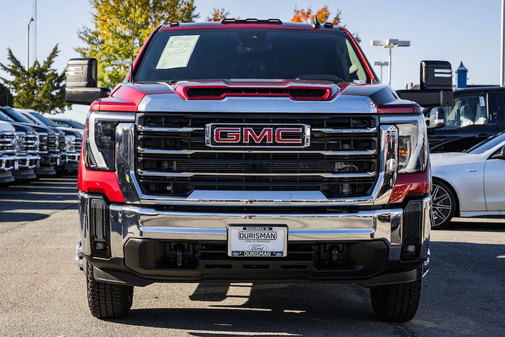 NAVIGATION / GPS / NAV, BLIS / BLIND SPOT MONITORING / BLIND SIDE ALERT, LANE DEPARTURE WARNING, LANE DEPARTURE ALERT / LANE KEEPING ALERT, REARVIEW CAMERA / BACK UP CAMERA / REVERSE CAMERA, REAR VIEW CAMERA WDYNAMIC GUIDELINES, ANDROID AUTO & APPLE CARPLAY, POWER WINDOWS & LOCKS, FOUR WHEEL DRIVE / 4WD / 4X4, STEERING WHEEL AUDIO CONTROLS, CRUISE CONTROL, REMOTE START, PUSH-BUTTON START, POWER TAILGATE LOCK, BLUETOOTH AUDIO STREAMING, 10-Way Power Driver Seat Adjuster w/Lumbar, 120-Volt Bed Mounted Power Outlet, 120-Volt Instrument Panel Power Outlet, 2 Charge-Only Rear USB Ports, 4-Way Manual Passenger Seat Adjuster, 6 Speakers, ABS brakes, Air Conditioning, AM/FM radio: SiriusXM with 360L, Apple CarPlay/Android Auto, Automatic Emergency Braking, Brake assist, Buckle to Drive, Cloth Seat Trim, Compass, Dual-Zone Automatic Climate Control, Electric Rear-Window Defogger, Engine Block Heater, Front 40/20/40 Split-Bench Seats w/Lockable Storage, Front Center Armrest w/Storage, Heated Driver & Front Outboard Passenger Seats, Heated Steering Wheel, Hitch Guidance w/Hitch View, Integrated Trailer Brake Controller, Keyless Open & Start, Lane Departure Warning System, LED Fog Lamps, Low tire pressure warning, Manual Tilt-Wheel/Telescoping Steering Column, Passenger door bin, Pickup Bed, Power steering, Power windows, Premium audio system: Premium GMC Infotainment System, Push Button Start, Remote keyless entry, Remote Start Package, Remote Vehicle Starter System, SLE Convenience Package, SLE Heat Package, SLE Value Package, Speed control, Spray-On Pickup Bedliner w/GMC Logo, Steering Wheel Audio Controls, Steering wheel mounted audio controls, Trip computer, Turn signal indicator mirrors, Unauthorized Entry Theft-Deterrent System, Wireless Phone Projection. 2024 GMC Sierra 3500HD SLE 4WD Volcanic Red Tintcoat Duramax 6.6L V8 Turbodiesel