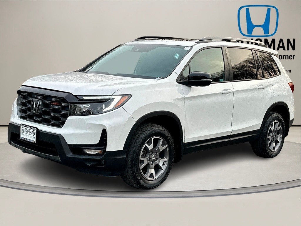 ONE OWNER, CLEAN CARFAX, LIKE NEW, DEALER WARRANTY INCLUDED!, 4-Wheel Disc Brakes, 4.334 Axle Ratio, 7 Speakers, A/V remote: CabinControl, ABS brakes, Air Conditioning, Alloy wheels, AM/FM radio: SiriusXM, Apple CarPlay/Android Auto, Auto High-beam Headlights, Auto-dimming Rear-View mirror, Automatic temperature control, Blind Spot Information (BSI) System warning, Brake assist, Bumpers: body-color, Compass, Delay-off headlights, Driver door bin, Driver vanity mirror, Driver's Seat Mounted Armrest, Dual front impact airbags, Dual front side impact airbags, Electronic Stability Control, Emergency communication system: HondaLink Assist, Exterior Parking Camera Rear, Forward collision: Collision Mitigation Braking System (CMBS) + FCW mitigation, Four wheel independent suspension, Front anti-roll bar, Front Bucket Seats, Front Center Armrest, Front dual zone A/C, Front fog lights, Front reading lights, Fully automatic headlights, Garage door transmitter: HomeLink, Heated door mirrors, Heated Front Bucket Seats, Heated front seats, Illuminated entry, Lane departure: Lane Keeping Assist System (LKAS) active, Leather-Trimmed Seats w/Orange Stitching, Low tire pressure warning, Memory seat, Navigation system: Honda Satellite-Linked Navigation System, Occupant sensing airbag, Outside temperature display, Overhead airbag, Overhead console, Panic alarm, Passenger door bin, Passenger seat mounted armrest, Passenger vanity mirror, Power door mirrors, Power driver seat, Power Liftgate, Power moonroof, Power passenger seat, Power steering, Power windows, Radio data system, Radio: 215-Watt Audio System w/7 Speakers, Rear air conditioning, Rear anti-roll bar, Rear reading lights, Rear seat center armrest, Rear window defroster, Rear window wiper, Remote keyless entry, Roof rack-Cross Bars, Security system, Speed control, Speed-sensing steering, Split folding rear seat, Spoiler, Steering wheel mounted audio controls, Tachometer, Telescoping steering wheel, Tilt steering wheel, Traction control, Trip computer, Turn signal indicator mirrors, Variably intermittent wipers, Wheels: 18" Machine-Finish Alloy. 2022 Honda Passport TrailSport AWD Platinum White Pearl 3.5L V6 24V SOHC i-VTEC