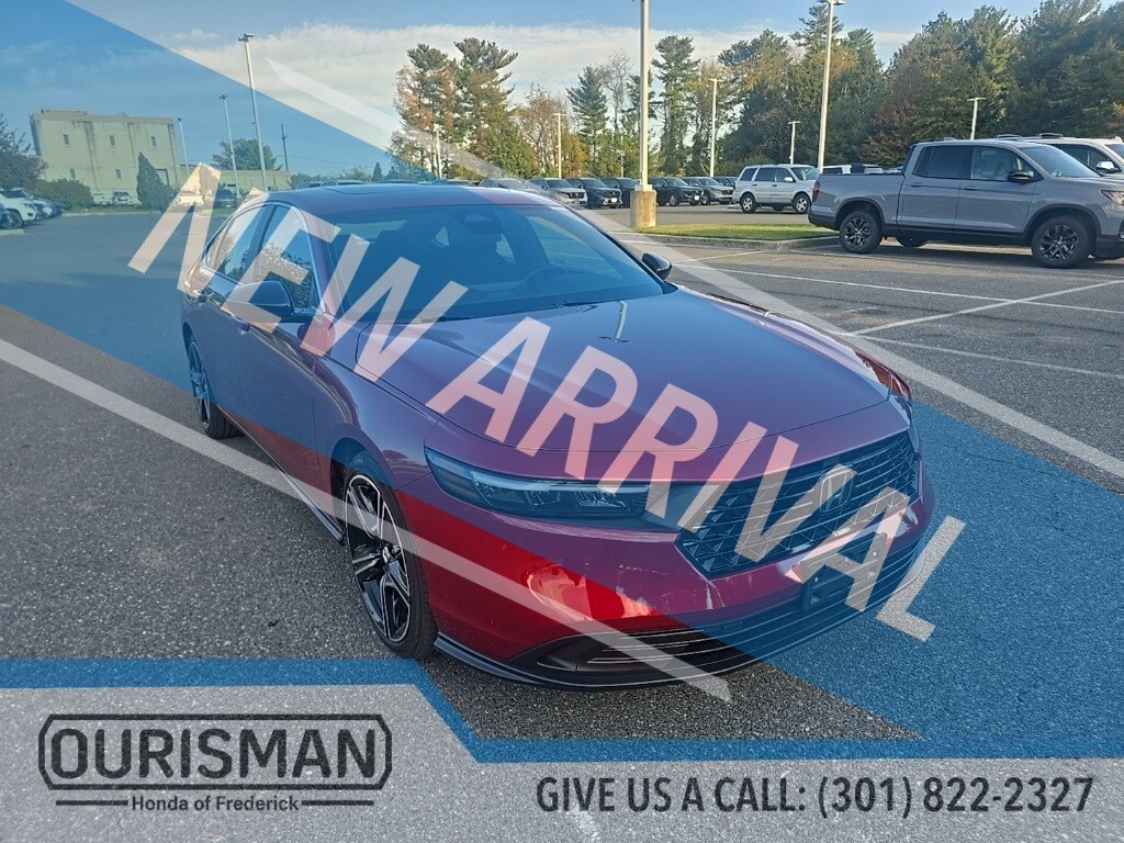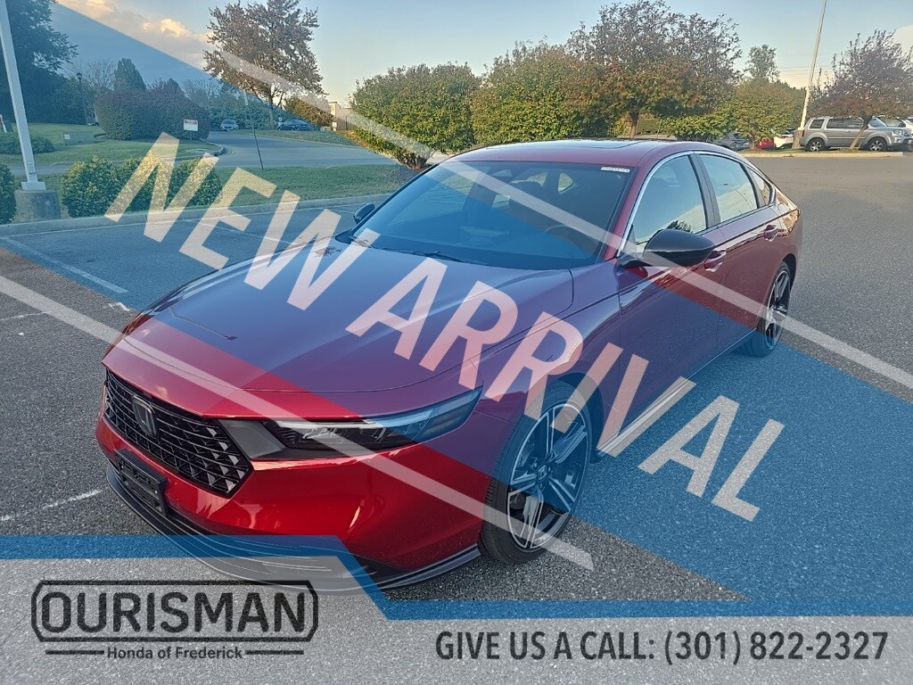 Ourisman Honda of Frederick is pleased to present this 2024 Honda Accord Hybrid Sport. The 2024 Honda Accord Hybrid Sport is a sleek and efficient midsize sedan that blends sporty design with advanced hybrid technology. It is powered by a 2.0-liter four-cylinder engine paired with Honda’s two-motor hybrid system, delivering a combined 204 horsepower and smooth, responsive acceleration. The exterior boasts a bold, athletic look with 19-inch gloss black alloy wheels, a black rear spoiler, LED headlights, and a gloss black front grille. Inside, the Accord Hybrid Sport features a spacious and modern cabin with sport-style cloth and synthetic leather-trimmed seats, a power-adjustable driver's seat, and a leather-wrapped steering wheel. The technology suite includes a 12.3-inch touchscreen infotainment system with wireless Apple CarPlay® and Android Auto™, a 6-speaker audio system, and a digital driver’s display. Convenience features such as a push-button start, remote engine start, dual-zone automatic climate control, and a sunroof enhance the driving experience. Safety is a priority with the Honda Sensing® suite, which includes adaptive cruise control, lane-keeping assist, traffic sign recognition, forward collision warning, and automatic emergency braking. With its combination of sporty design, fuel efficiency, and advanced technology, the 2024 Accord Hybrid Sport is an excellent choice for drivers looking for a dynamic yet eco-friendly sedan.