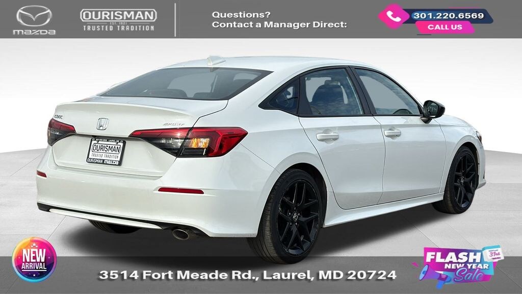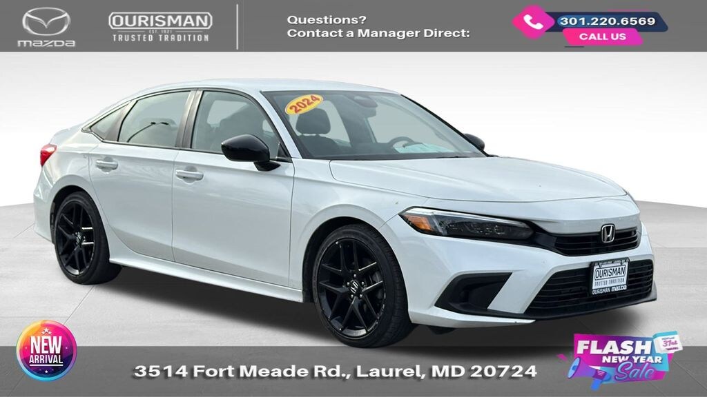 2024 Honda Civic Sport White FWD CARFAX One-Owner. BLUETOOTH/HANDS FREE, REAR VIEW CAMERA/BACKUP CAMERA, BLIND SPOT MONITORING SYSTEM, LANE KEEP ASSIST/LANE MITIGATION/ACTIVE LANE ASSIST, APPLE CARPLAY/ANDROID AUTO, PRE-COLLISION SYSTEM/BRAKE SYSTEM, No accidents or damage reported to CARFAX, 1 OWNER CARFAX, Black Artificial Leather. Buyers should take pride in knowing that Maryland has one of the most comprehensive state inspections in the country. Awards: * ALG Residual Value Awards, Residual Value Awards We know you have done a great deal of research, and you don't have time for hours of back-and-forth negotiations. At Ourisman Laurel Campus, your hassle-free purchase is backed by our extensive Market Research. Our No-Haggle pricing ensures you the best value on your vehicle-no games, no gimmicks. Unlike our competitors, we don't add any additional fees to the posted price or certification. You pay only the posted price of the vehicle plus Sales tax, your registration and a MD processing charge of $800Not required by law. Come see why Ourisman Mazda, Mitsubishi, Hyundai, Nissan in Laurel (Ourisman Laurel Campus) offers you the best value for your money! Serving Frederick, Rockville, Hagerstown, Potomac, Baltimore, Silver Spring, DC, Howard County, Washington County, Montgomery County, Anne Arundel. Maryland State Inspected with over 120 point inspection performed by a trained technician. Buyers should take pride in knowing that Maryland has one of the most comprehensive state inspections in the country.