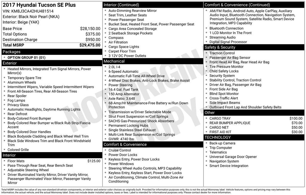 Equipped with a 2.0L DOHC engine and 6-Speed Automatic with Shiftronic transmission, this Tucson delivers a smooth and efficient ride, with an impressive 21 city / 26 highway MPG. The all-wheel-drive system ensures confident handling in any driving condition, while the 17-inch alloy wheels and heated front bucket seats with power driver's seat add a touch of sophistication.