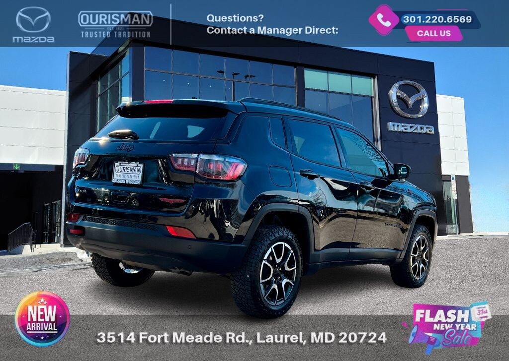 2024 Jeep Compass Trailhawk Diamond Black Crystal Pearlcoat 4WD CARFAX One-Owner. BLUETOOTH/HANDS FREE, REAR VIEW CAMERA/BACKUP CAMERA, BLIND SPOT MONITORING SYSTEM, LANE KEEP ASSIST/LANE MITIGATION/ACTIVE LANE ASSIST, APPLE CARPLAY/ANDROID AUTO, PRE-COLLISION SYSTEM/BRAKE SYSTEM, ACTIVE CRUISE CONTROL/ADAPTIVE CRUISE CONTROL, 4WD, 4X4, 4 WHEEL DRIVE, 1 OWNER CARFAX, ADVANCED KEYLESS ENTRY, REAR CROSS TRAFFIC ALERT, PREMIUM CLOTH AND LEATHER TRIMMED INTERIOR, 4WD. Buyers should take pride in knowing that Maryland has one of the most comprehensive state inspections in the country. Awards: * ALG Residual Value Awards, Residual Value Awards We know you have done a great deal of research, and you don't have time for hours of back-and-forth negotiations. At Ourisman Laurel Campus, your hassle-free purchase is backed by our extensive Market Research. Our No-Haggle pricing ensures you the best value on your vehicle-no games, no gimmicks. Unlike our competitors, we don't add any additional fees to the posted price or certification. You pay only the posted price of the vehicle plus Sales tax, your registration and a MD processing charge of $800Not required by law. Come see why Ourisman Mazda, Mitsubishi, Hyundai, Nissan in Laurel (Ourisman Laurel Campus) offers you the best value for your money! Serving Frederick, Rockville, Hagerstown, Potomac, Baltimore, Silver Spring, DC, Howard County, Washington County, Montgomery County, Anne Arundel. Maryland State Inspected with over 120 point inspection performed by a trained technician. Buyers should take pride in knowing that Maryland has one of the most comprehensive state inspections in the country.