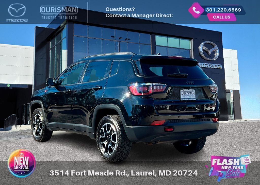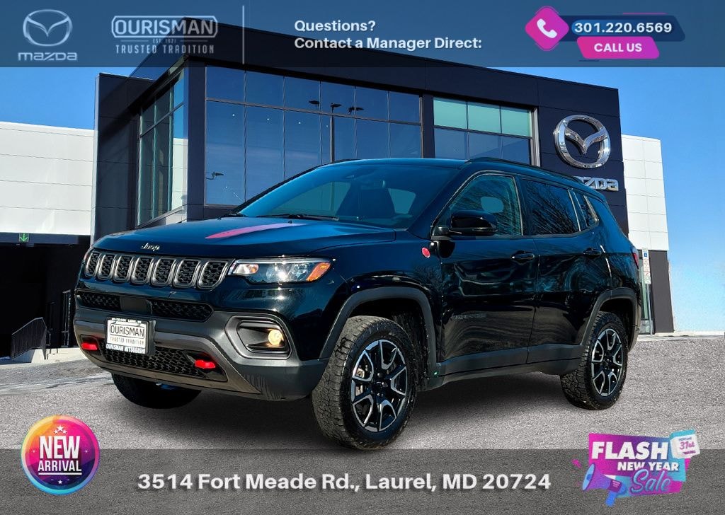 2024 Jeep Compass Trailhawk Diamond Black Crystal Pearlcoat 4WD CARFAX One-Owner. BLUETOOTH/HANDS FREE, REAR VIEW CAMERA/BACKUP CAMERA, BLIND SPOT MONITORING SYSTEM, LANE KEEP ASSIST/LANE MITIGATION/ACTIVE LANE ASSIST, APPLE CARPLAY/ANDROID AUTO, PRE-COLLISION SYSTEM/BRAKE SYSTEM, ACTIVE CRUISE CONTROL/ADAPTIVE CRUISE CONTROL, 4WD, 4X4, 4 WHEEL DRIVE, 1 OWNER CARFAX, ADVANCED KEYLESS ENTRY, REAR CROSS TRAFFIC ALERT, PREMIUM CLOTH AND LEATHER TRIMMED INTERIOR, 4WD. Buyers should take pride in knowing that Maryland has one of the most comprehensive state inspections in the country. Awards: * ALG Residual Value Awards, Residual Value Awards We know you have done a great deal of research, and you don't have time for hours of back-and-forth negotiations. At Ourisman Laurel Campus, your hassle-free purchase is backed by our extensive Market Research. Our No-Haggle pricing ensures you the best value on your vehicle-no games, no gimmicks. Unlike our competitors, we don't add any additional fees to the posted price or certification. You pay only the posted price of the vehicle plus Sales tax, your registration and a MD processing charge of $800Not required by law. Come see why Ourisman Mazda, Mitsubishi, Hyundai, Nissan in Laurel (Ourisman Laurel Campus) offers you the best value for your money! Serving Frederick, Rockville, Hagerstown, Potomac, Baltimore, Silver Spring, DC, Howard County, Washington County, Montgomery County, Anne Arundel. Maryland State Inspected with over 120 point inspection performed by a trained technician. Buyers should take pride in knowing that Maryland has one of the most comprehensive state inspections in the country.
