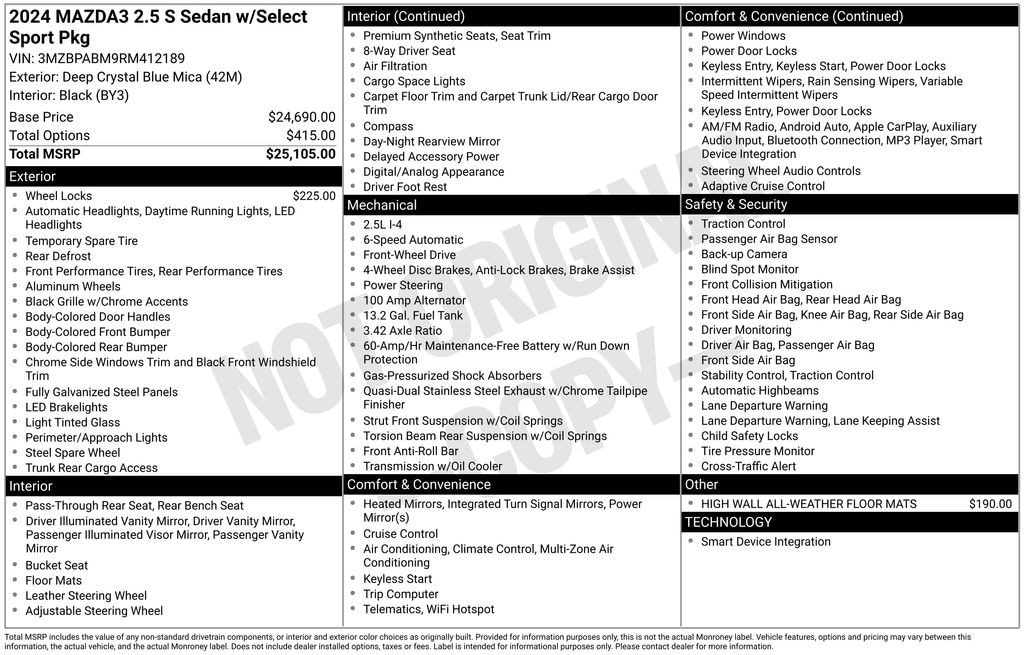 2024 Mazda Mazda3 2.5 S Select Sport Base Deep Crystal Blue Mica FWD CARFAX One-Owner. BLUETOOTH/HANDS FREE, REAR VIEW CAMERA/BACKUP CAMERA, BLIND SPOT MONITORING SYSTEM, LANE KEEP ASSIST/LANE MITIGATION/ACTIVE LANE ASSIST, APPLE CARPLAY/ANDROID AUTO, PRE-COLLISION SYSTEM/BRAKE SYSTEM, ACTIVE CRUISE CONTROL/ADAPTIVE CRUISE CONTROL, 1 OWNER CARFAX. Buyers should take pride in knowing that Maryland has one of the most comprehensive state inspections in the country. Awards: * ALG Residual Value Awards, Residual Value Awards We know you have done a great deal of research, and you don't have time for hours of back-and-forth negotiations. At Ourisman Laurel Campus, your hassle-free purchase is backed by our extensive Market Research. Our No-Haggle pricing ensures you the best value on your vehicle-no games, no gimmicks. Unlike our competitors, we don't add any additional fees to the posted price or certification. You pay only the posted price of the vehicle plus Sales tax, your registration and a MD processing charge of $800Not required by law. Come see why Ourisman Mazda, Mitsubishi, Hyundai, Nissan in Laurel (Ourisman Laurel Campus) offers you the best value for your money! Serving Frederick, Rockville, Hagerstown, Potomac, Baltimore, Silver Spring, DC, Howard County, Washington County, Montgomery County, Anne Arundel. Maryland State Inspected with over 120 point inspection performed by a trained technician. Buyers should take pride in knowing that Maryland has one of the most comprehensive state inspections in the country.