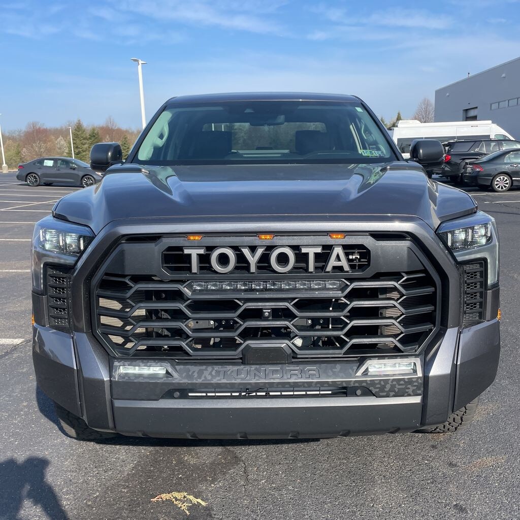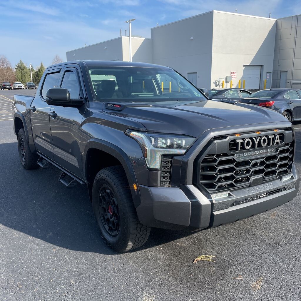 Prices on vehicles include freight and destination charges (applies to new vehicles only) , as well as a $999 Dealer Processing Fee. PANORAMIC ROOF / DUAL SUNROOFS / TWIN PANEL MOONROOF, POWER MOONROOF / SUNROOF / POWER TILT SLIDING ROOF, VOICE ACTIVATED NAVIGATION, NAVIGATION / GPS / NAV, DYNAMIC RADAR CRUISE CONTROL / ADAPTIVE CRUISE CONTROL / SMART CRUISE CONTROL, LANE DEPARTURE WARNING, LANE DEPARTURE ALERT / LANE KEEPING ALERT, LANE DEPARTURE w/ STEERING ASSIST, LANE DEPARTURE WARNING, REARVIEW CAMERA / BACK UP CAMERA / REVERSE CAMERA, REAR VIEW CAMERA W/DYNAMIC GUIDELINES, ANDROID AUTO & APPLE CARPLAY, HEATED & COOLED FRONT ROW SEATS, HEATED FRONT ROW SEATS, POWER WINDOWS & LOCKS, FOUR WHEEL DRIVE / 4WD / 4X4, STEERING WHEEL AUDIO CONTROLS, CRUISE CONTROL, PUSH-BUTTON START, PREMIUM AUDIO SOUND SYSTEM, POWER TAILGATE LOCK, BLUETOOTH AUDIO STREAMING, BLUETOOTH & BLUETOOTH STREAMING, BLUETOOTH HANDS-FREE PHONE SYSTEM, ONE OWNER, LEATHERETTE SEATS, HEATED STEERING WHEEL, BLUETOOTH, AUTOMATIC HIGH BEAMS, AUTO HIGH BEAMS, TOYOTA SAFETY SENSE, JBL PREMIUM SOUND SYSTEM***, 12 Speakers, 3.31 Axle Ratio, 4-Wheel Disc Brakes, 400W/120V AC Rear Seat & Bed Power Supply, ABS brakes, Air Conditioning, Alloy wheels, AM/FM radio: SiriusXM, Apple CarPlay/Android Auto, Auto High-beam Headlights, Auto-dimming Rear-View mirror, Automatic temperature control, Bed Step (TMS), Black Dual Exhaust Tips w/Debossed TRD Pro Logo, Brake assist, Bumpers: body-color, Delay-off headlights, Electronic Stability Control, Front & Rear Mud Guards, Front Bucket Seats, Front Center Armrest, Front dual zone A/C, Front fog lights, Front reading lights, Fully automatic headlights, Heated & Ventilated Front Bucket Seats, Heated Color-Keyed Outside Mirrors, Heated front seats, Heated steering wheel, Illuminated entry, Leather Shift Knob, LED Lightbar w/Fog & Marker Lights, Low tire pressure warning, Multi-Terrain Back Monitor, Navigation System, Panic alarm, Panoramic View Back Monitor, Passenger door bin, Power driver seat, Power moonroof, Power Panoramic Roof, Power passenger seat, Power steering, Power windows, Qi-Compatible Wireless Smartphone Charger, Radio data system, Radio: Premium Audio w/JBL, Rear reading lights, Rear seat center armrest, Rear step bumper, Rear window defroster, Remote keyless entry, Security system, Smoked-Finish Premium LED Headlights & DRL, SofTex Seat Trim, Speed control, Speed-sensing steering, Split folding rear seat, Stainless Steel Door Edge Guards (TMS), Steering wheel mounted audio controls, Tachometer, Telescoping steering wheel, Tilt steering wheel, Towing Technology Package, Traction control, TRD Performance Air Filter (TMS), TRD Pro Heated Leather-Trimmed Steering Wheel, TRD Pro Package, Trip computer, Turn signal indicator mirrors, Variably intermittent wipers, Ventilated front seats, Voltmeter, Wheels: 18" x 8" Black BBS Forged Aluminum. 2023 Toyota Tundra Hybrid TRD Pro 4WD Magnetic Gray Metallic 3.4L V6